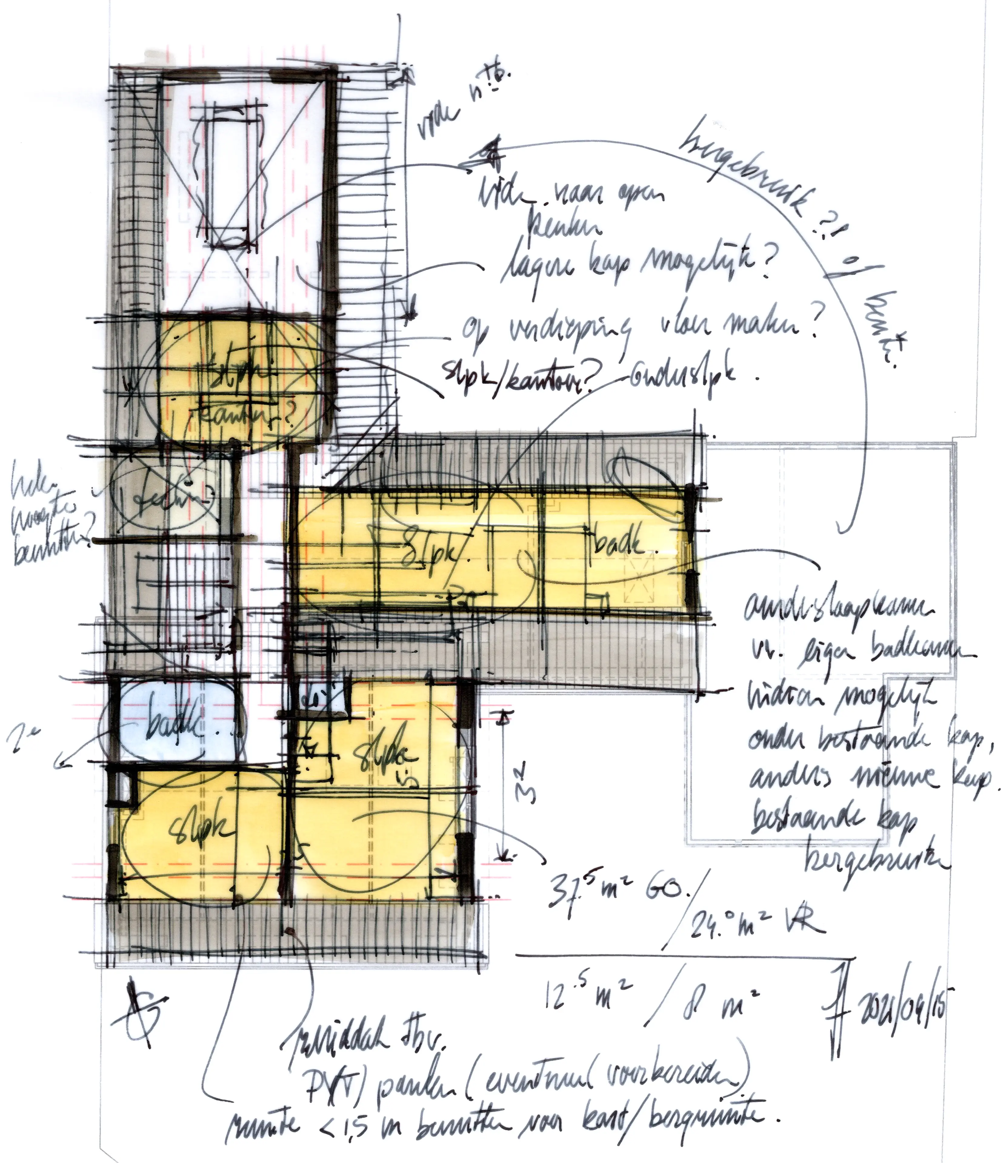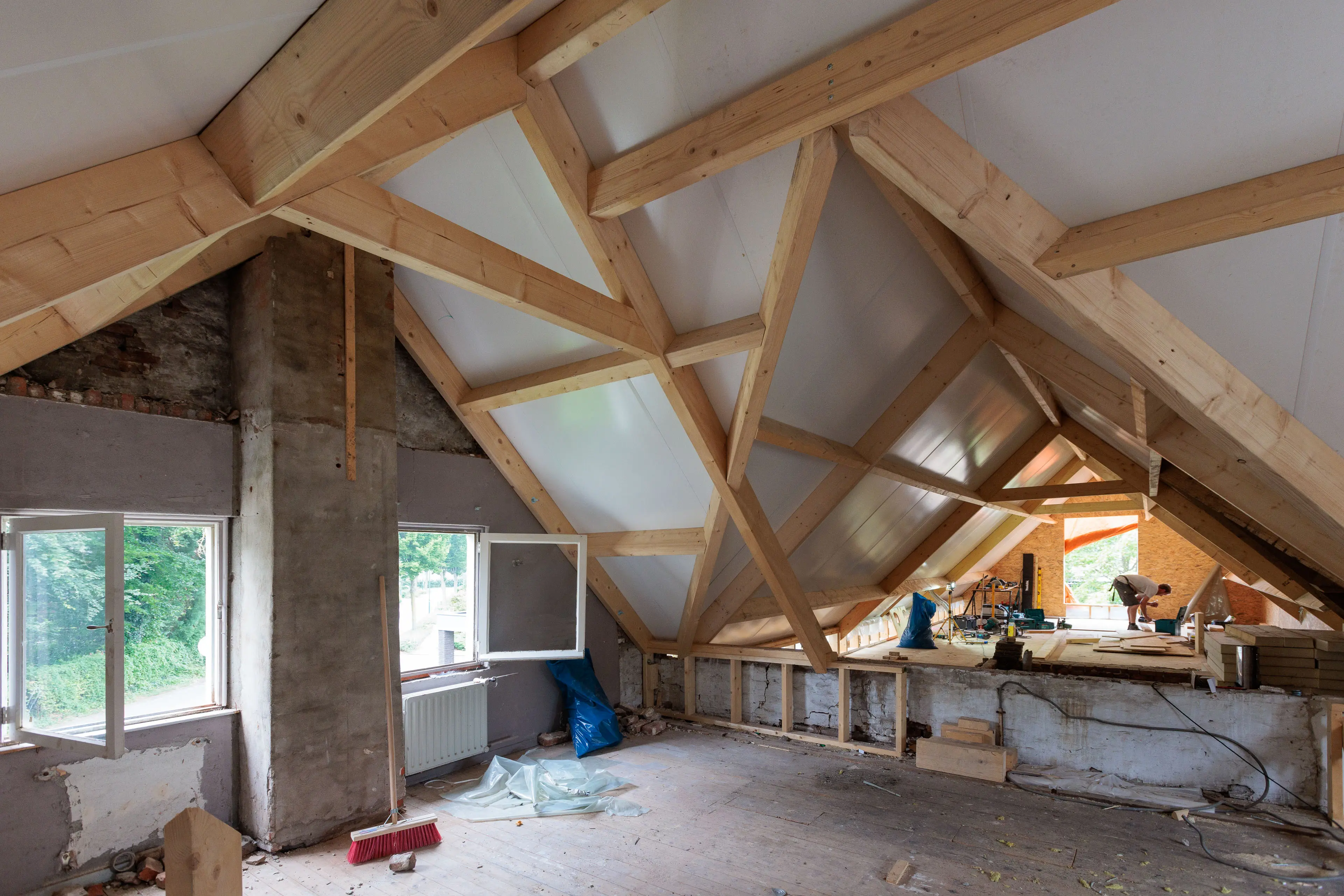 De hellende daken van het hoofd- en bijgebouw zijn compleet vernieuwd waarbij het asbesthoudende dakbeschot gesaneerd en vervangen is door een goed isolerende dakplaat. Een nieuwe dakopbouw op de aanbouw aan de achterzijde biedt ruimte voor een ruime ouderslaapkamer, bijbehorende badkamer en techniek- en bergruimte. Door deze kap een overstek aan de tuinzijde te geven kon het volume van de dakopbouw gemaximaliseerd worden en ontstaat op de begane grond een overdekte achterom. Een groot raam in de topgevel geeft vanuit het bed een mooi zicht op de tuin en de grote boom daarin en dakvensters brengen licht in de slaapkamer, de badkamer en trapvide.